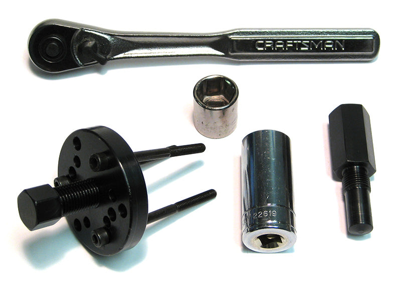 Install the PKT Universal Puller using the three 5mm bolts that line up with the three tapped holes in the clutch hub as shown. Make sure that the three bolts are screwed in equally so that the puller body is parrallel with the clutch face.